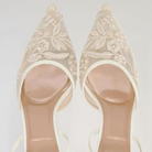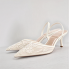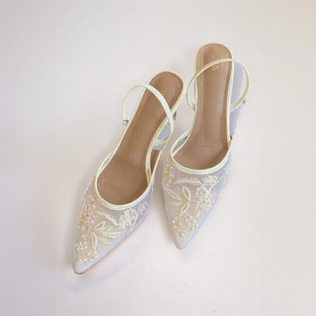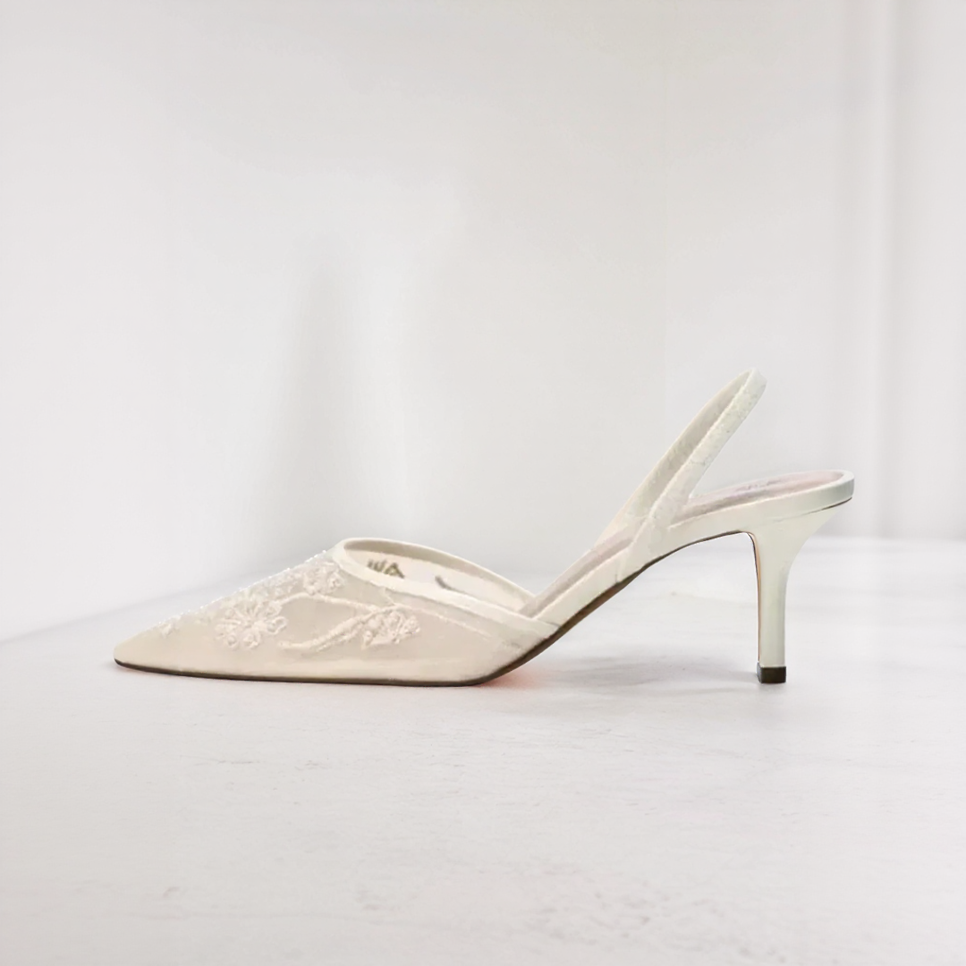 تتميز هذه الأحذية ذات الكعب بتطريز زهور رقيق على قاعدة صلبة خفيفة وشفافة. يطيل طرفها المدبب القوام بأناقة، بينما يضمن الشريط المكيف ثباتاً آمناً مع إضافة لمسة من الرقي.