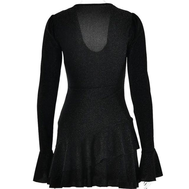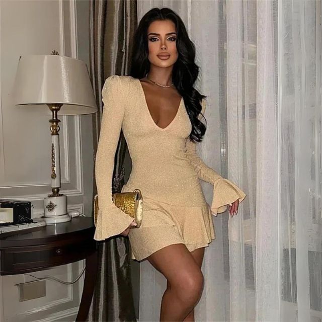 هذه الفستان اللامع مثالي للتألق في لياليكم. أكمامه الواسعة تضيف لمسة من الرقي. قصته الجذابة تبرز قوامك.