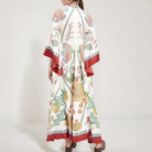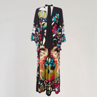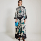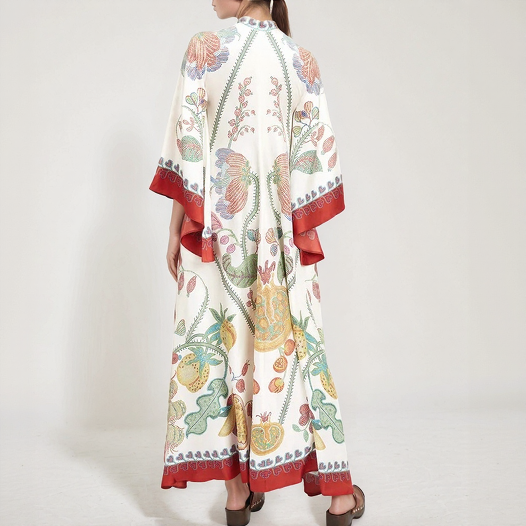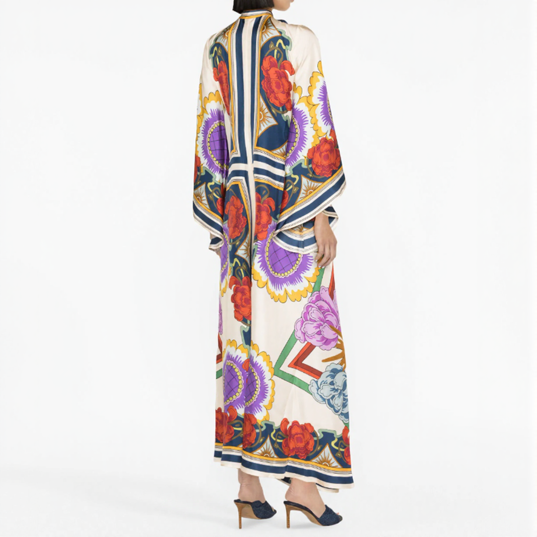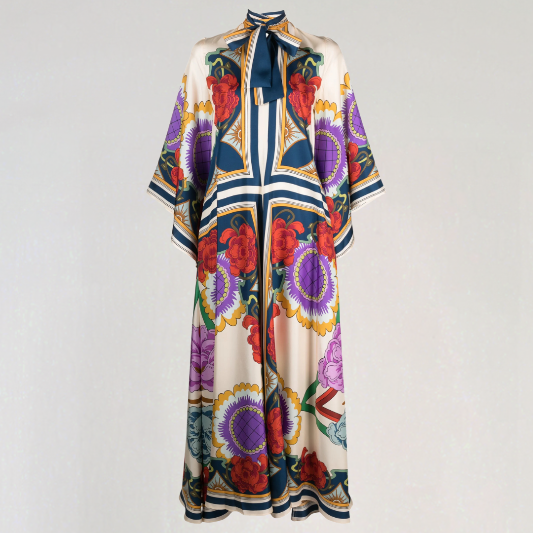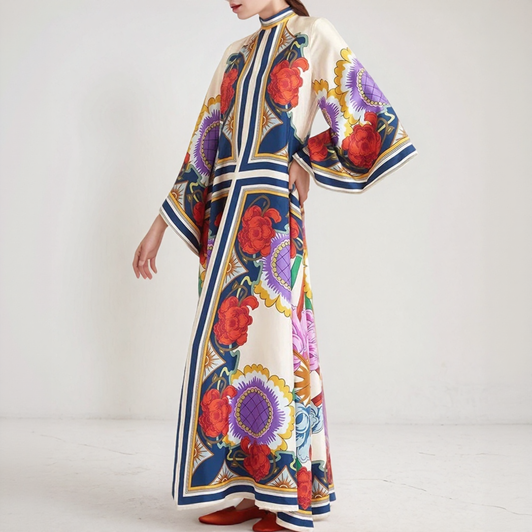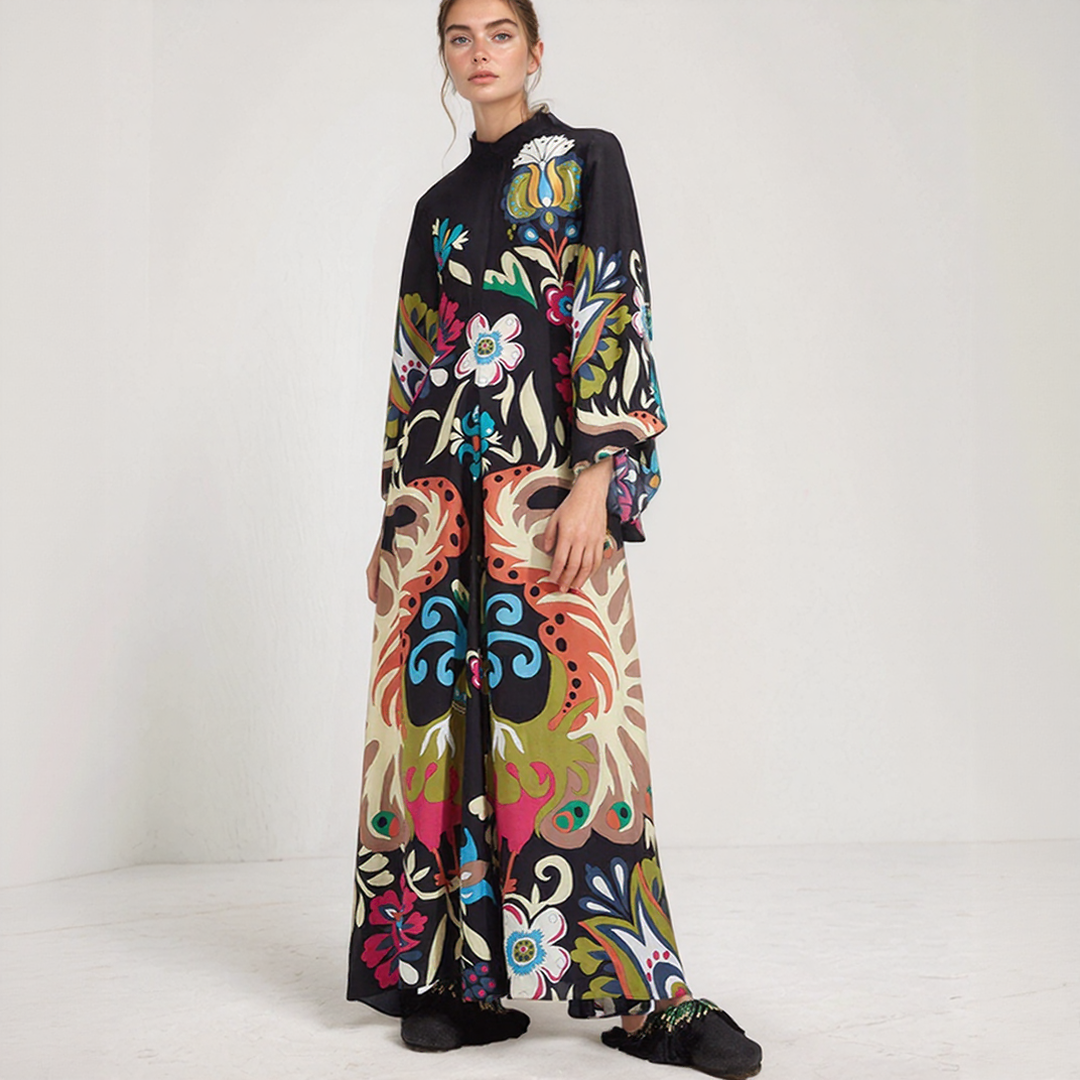 Tato dlouhá šaty mají odvážné květinové vzory a volný střih. Její vysoký límec s detailem uzlu na zadní straně dodává sofistikovaný nádech. Perfektní pro všechny roční období, nabízí nadčasovou bohémskou eleganci.