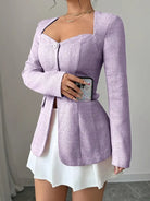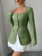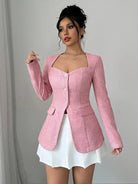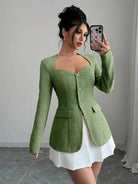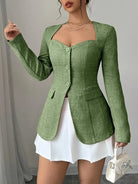 Αυτή η κουμπωτή ζακέτα αναδεικνύει τη σιλουέτα με την εφαρμοστή της γραμμή και τον σύγχρονο τετράγωνο λαιμόκοψή της. Ιδανική για μια κομψή και θηλυκή εμφάνιση, φοριέται εξίσου καλά στο γραφείο όσο και σε έξοδο. Ο προσεγμένος σχεδιασμός της και τα λεπτά κουμπιά προσθέτουν μια διαχρονική αίσθηση εκλέπτυνσης στην εμφάνισή σας.