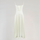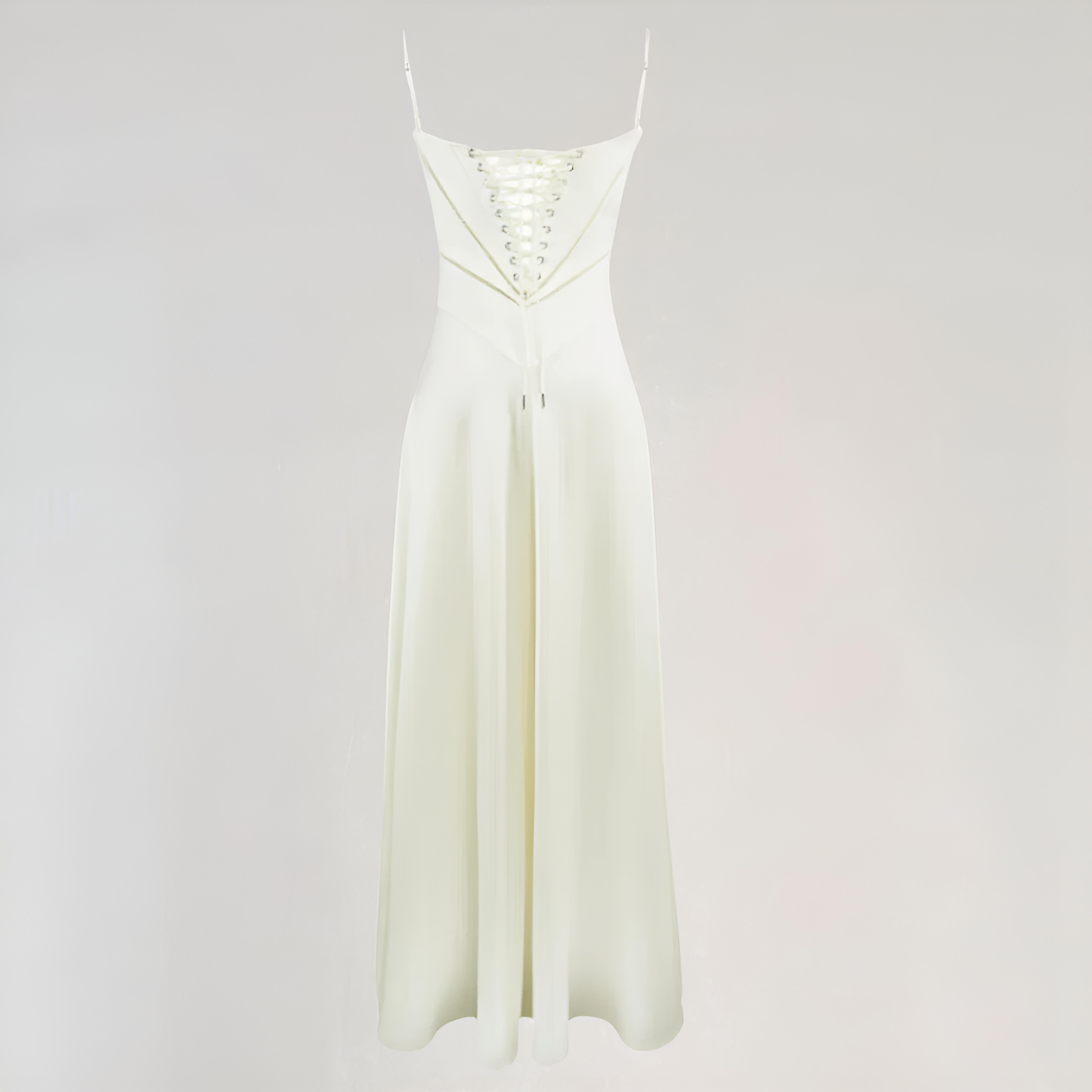 Αυτό το μακρύ φόρεμα αναδεικνύει τη σιλουέτα χάρη στο μπούστο του σε στυλ κορσέ που τονίζει διακριτικά τη μέση. Η ρευστή του γραμμή προσφέρει κίνηση και χάρη, ενώ η πλάτη με κορσέ προσθέτει μια ρομαντική και δομημένη πινελιά. Ιδανικό για βραδιές, γκαλά ή τελετές.