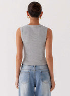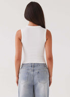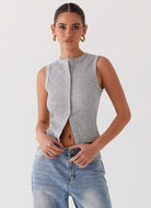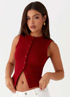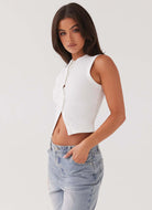 Tämä hihaton paita yhdistää imartelevan kapean leikkauksen ja elegantin napitusrivin. Helppo yhdistää, se sopii sekä rentoon että juhlallisempaan asuun. Kevyt ja trendikäs välttämättömyys kauniille kaudelle.