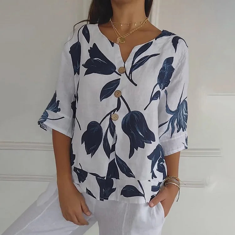 ג'אן | חולצת פרחים אלגנטית – כפתור מרכזי ושרוולים קצרים