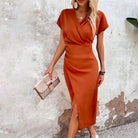 שמלות מידי זו מציעה חיתוך מחמיא עם צווארון V ושרוולים קצרים. הגוון החם שלה והחריץ העדין מוסיפים נגיעה של sophistication.