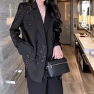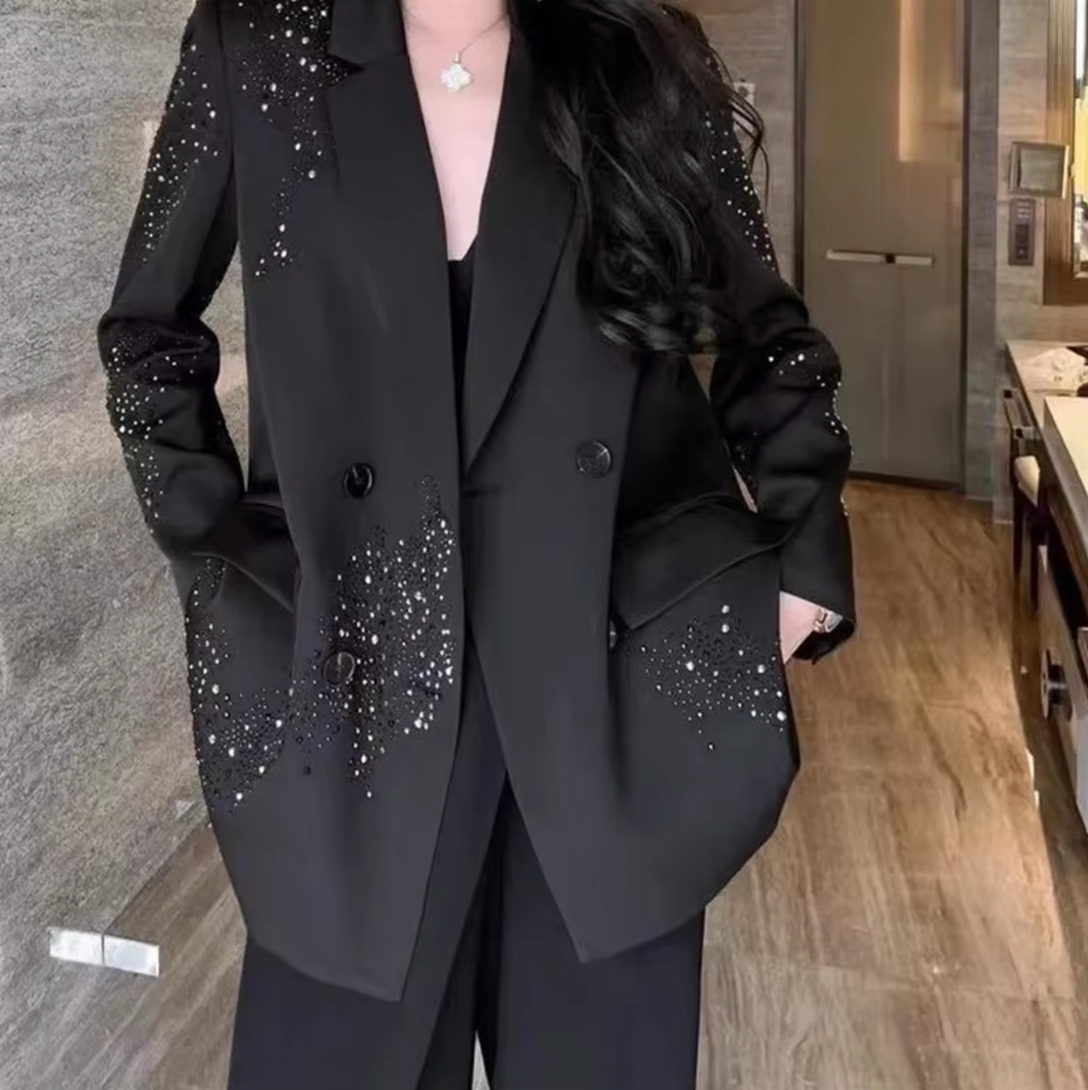 Ez a fekete dzseki a modern eleganciát testesíti meg, finom csillogással. Csillogó részletei kifinomult hangulatot adnak megjelenésének, anélkül, hogy túlzásba vinné. Tökéletes egy elegáns estélyhez vagy egy diszkrét, professzionális megjelenéshez, ötvözi a visszafogottságot és a ragyogást.