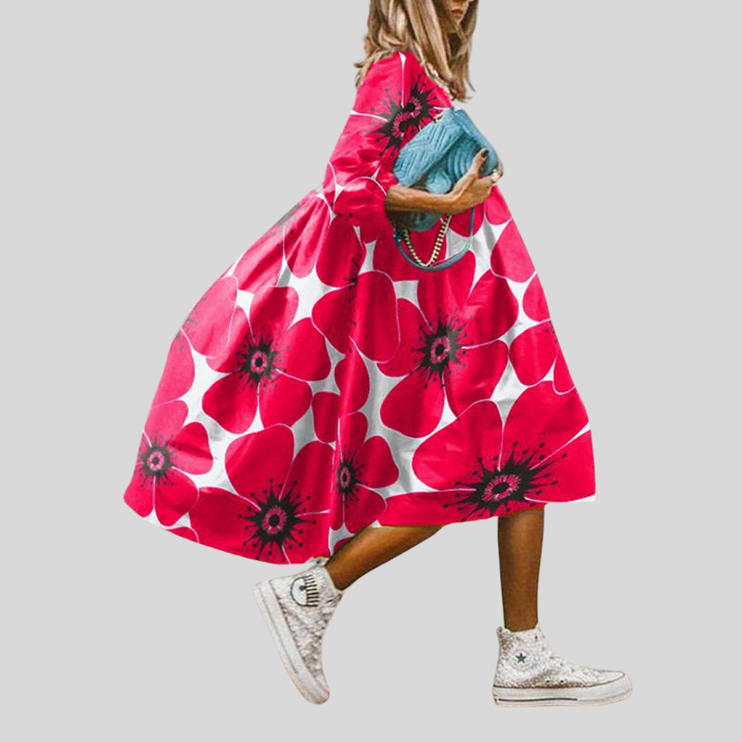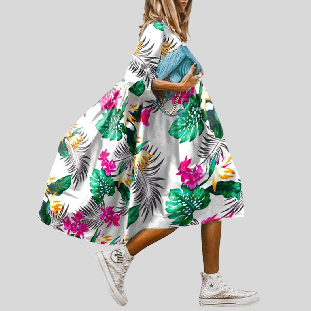 Denne midikjolen har et bohemsk blomsterdesign. Tilgjengelig i flere farger og størrelser. Perfekt for sommerdager.