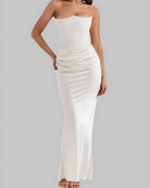 Denne lange, stroppeløse kjolen fremhever silhuetten med en både ren og sofistikert stil. Den strukturerte bodicen fremhever midjen delikat, mens den flytende skjørtet følger bevegelsene dine med eleganse. Et ideelt valg for kledde kvelder, mottakelser eller formelle arrangementer.