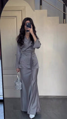Dette to-delte sæt kombinerer raffineret stil og absolut komfort. Bestående af en langærmet top med bælte og en lang, udvidet nederdel, skaber det en yndefuld og feminin silhuet. Ideelt til at fremhæve dine hverdagsøjeblikke såvel som dine mest specielle begivenheder.
