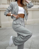 Dette sæt kombinerer en struktureret blazer med et matchende par bukser. Det giver en elegant og professionel silhuet. Perfekt til kontoret eller formelle lejligheder.